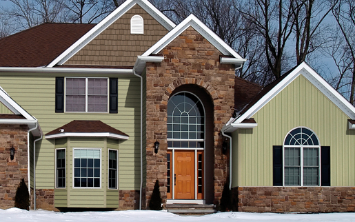 Here the siding is used here as an accent on the ends of the house in conjunction with clapboard and vinyl cedar shakes.