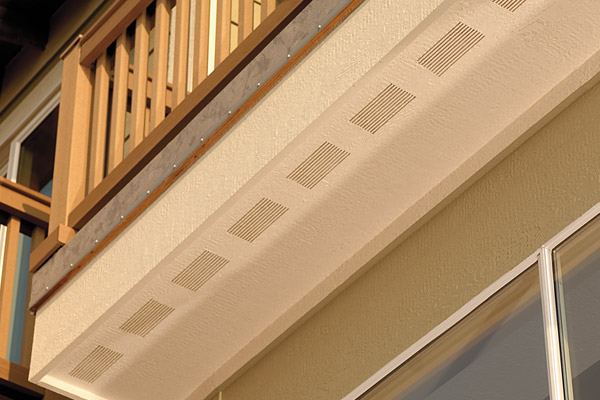 Engineered wood used as soffit with pre-cut vents. Good protection in areas where rot and mildew are always a problem. Making this house minimal maintenance and stylish too.